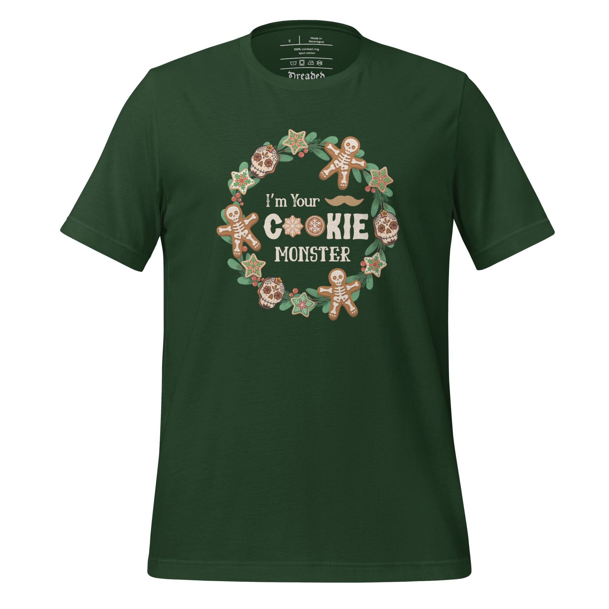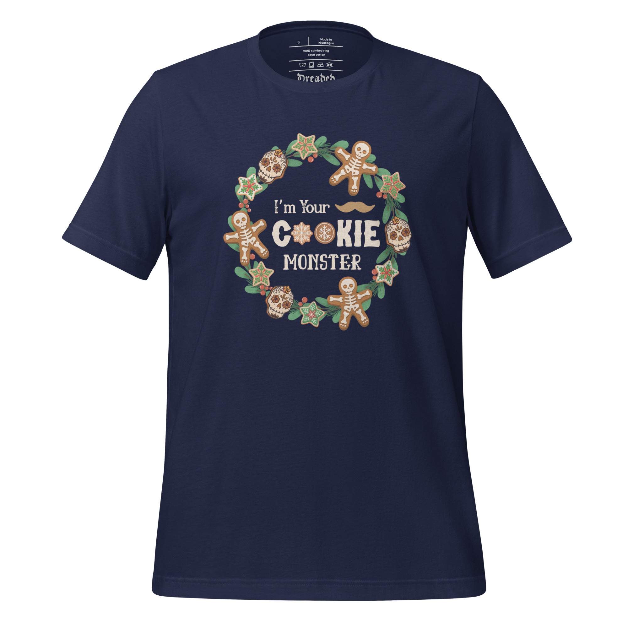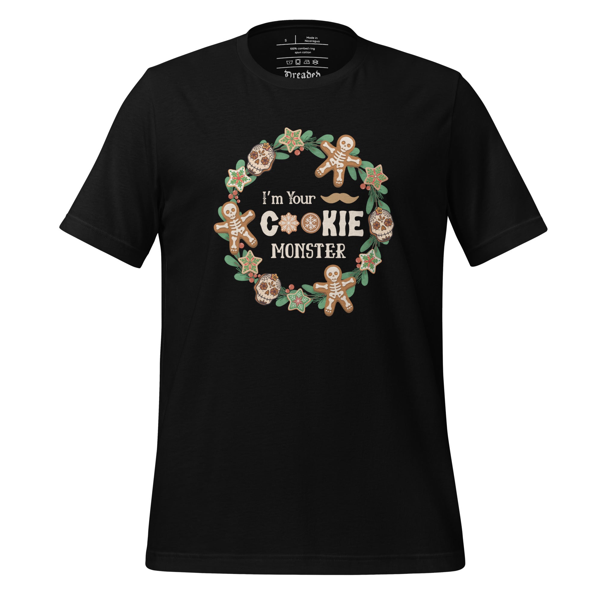 If Doc Holliday ever showed up to Christmas dinner… this would be his shirt. Our “I’m Your Cookie Monster” T-Shirt puts a darkly festive spin on the classic Western quote “I’m your huckleberry,” featuring bold typography framed inside a holly wreath decorated with spooky-cute holiday cookies.